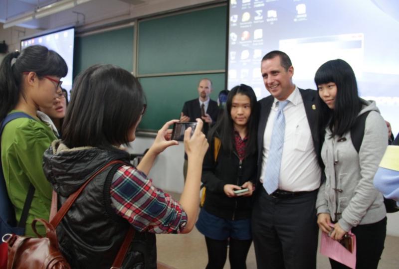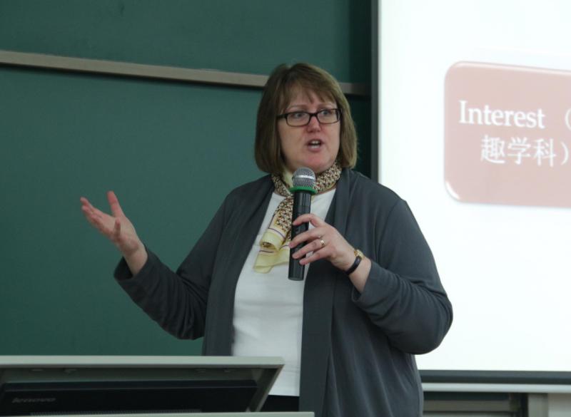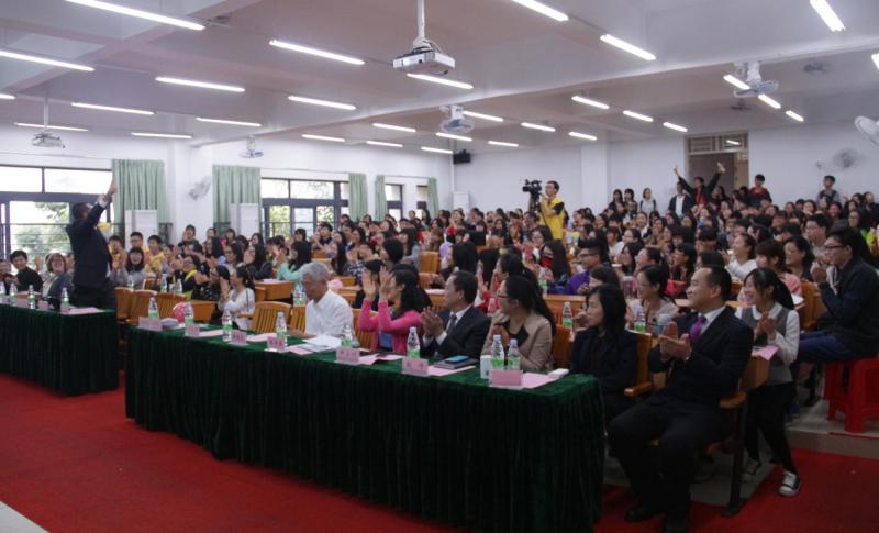 首次来到中国的Ms.Catherine Jackson对中国职工表示欢迎,他通过ppt展示“3+1”项目的英语水平要求、课程设置、学分体系等留学情况。期间,一幅旨在促进师生全面发展的3L(Learn Live Lead)图生动形象地为同学们指明了奋斗的目标,呼吁同学们为之努力。