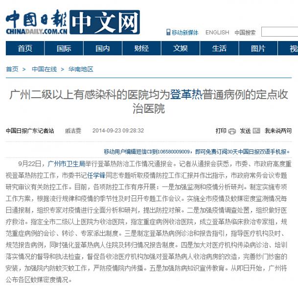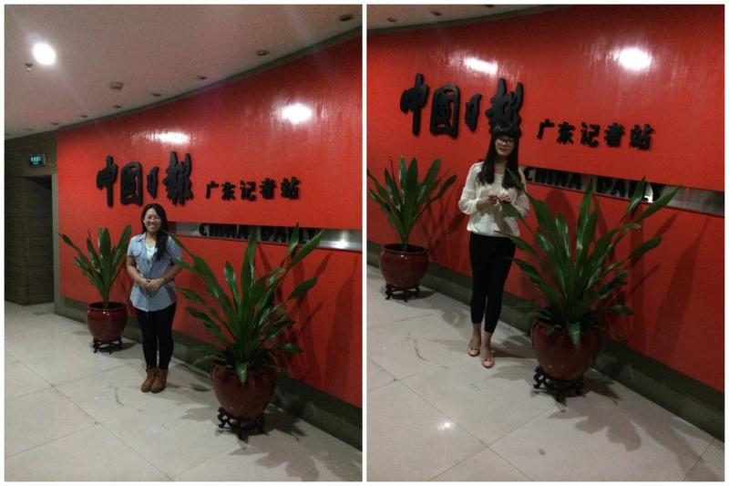 在此之前,我系2011级员工戚洁雯率先通过中国日报社广东记者站的层层选拔,于2014年8月4日正式开始实习。实习期间,戚洁雯同学虚心向记者站老师学习,发挥自身主观能动性,积极地分担各类事务,认真踏实地完成好分配的任务,深得记者站站长的肯定。在转岗至采编部后,在站长的指导下完成了关于9月22日广州市卫生局举行登革热防治工作情况通报会的新闻稿,并于9月23日发布至中国日报中文网(网址为:http://cnews.chinadaily.com.cn/2014-09/23/content_18644403.htm)。我系第二批实习生在中国日报社的筛选下,由2011级杨思莹同学获得实习岗位,于2014年9月15日正式上岗。