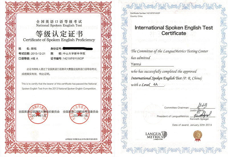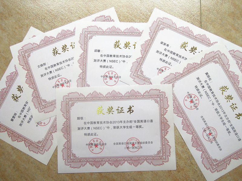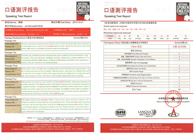 所有参赛员工通过组委会提供的考试终端参加历时将近30分钟的计算机口语测试(分为篇章朗读和话题阐述两个部分)。测评过程全部传输至美国语言测评中心进行测评处理并生成评报告,从准确度、流利度、完整度、韵律度、可被理解度、近母语值等方面对参赛选手的英语口语表达能力进行评估。口语测评报告详细地指出了员工的哪个单词、哪个音节发音错误,十分有助于员工自己改正提高发音质量。依据测评报告,每位参赛选手都获得一份由美国SRI口语测评系统判定的口语等级认定证书。目前,获奖证书、口语等级证书和口语测评报告都已经寄到了外国语言文学系。另外,外语系欧衍伽老师获得中国教育技术协会和全国英语口语测评大赛组委会颁发的“优秀组织奖”。