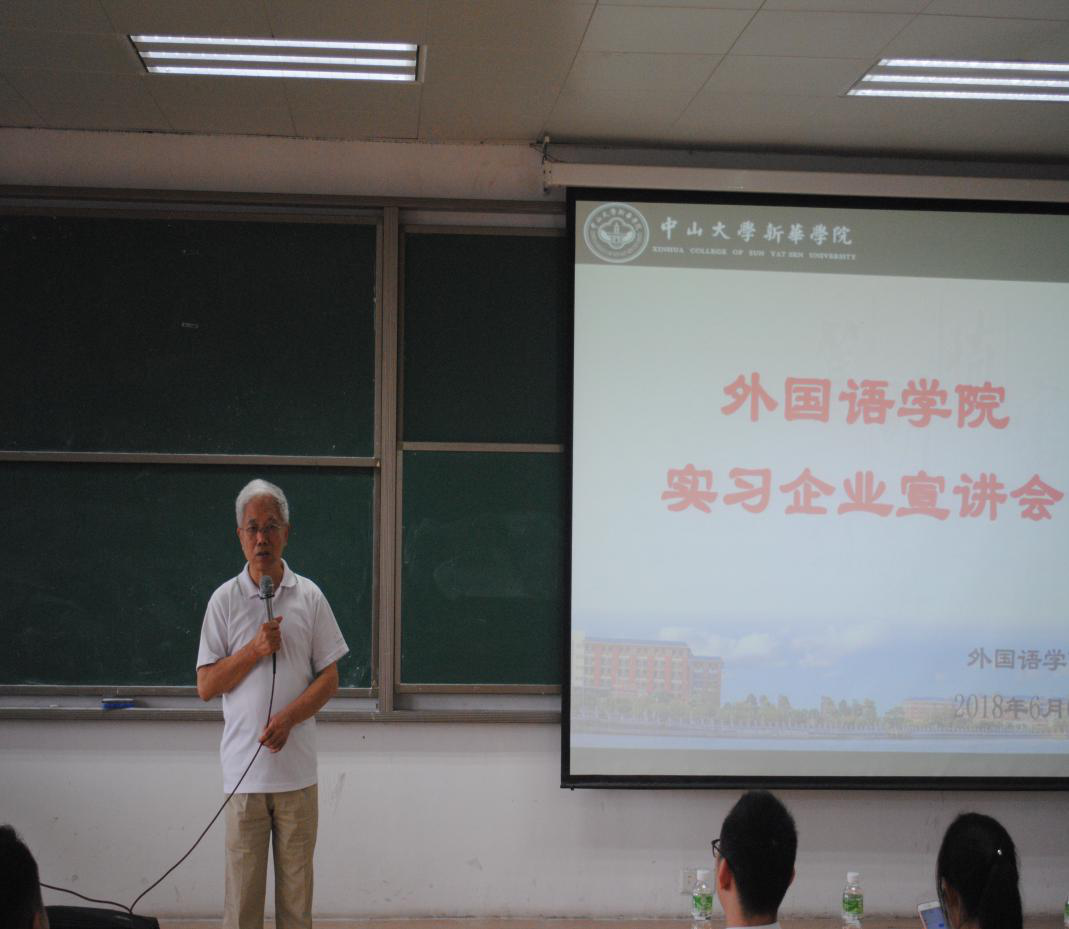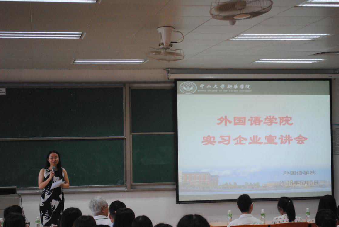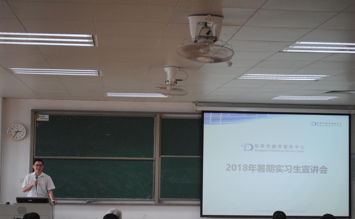 2018年6月6日下午,由太阳成集团tyc(下文简称“外院”)主办的太阳成集团tyc2015级翻译教育类实习宣讲会在公司东莞校区定静楼②DA602顺利举行。此次宣讲会诚邀东莞市翻译服务中心代表、广东华英教育集团代表和学易优教育集团代表作为主讲嘉宾作企业宣讲。外院副经理黄继炎、实践部主任李文蓓、教师洪茹及外院2015级学子共同参加了此次宣讲会。