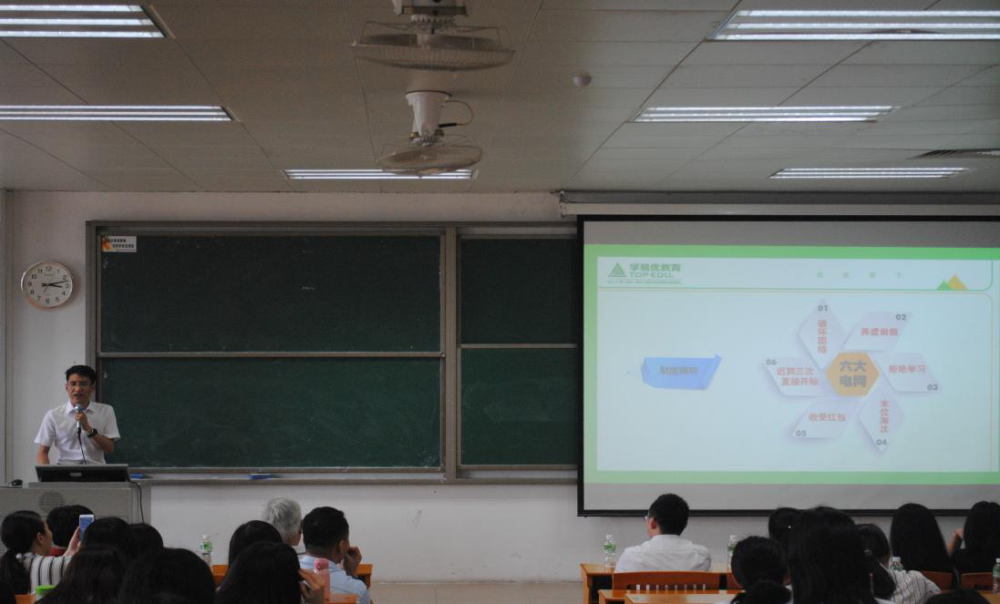 接着,广东华英教育集团中山校区负责人从其公司情况与公司业务展开介绍。而学易优教育集团李焕德董事长则从公司的制度模块、公司沿革、公司模式、招聘岗位、晋升渠道、薪酬福利等方面展示本公司的优势,该企业希望在场的学子能够积极报名,踊跃参与。这两家企业为在场的学子们介绍了教育的职场环境和岗位需求,这使得刚开始工作的同学们有了很多的发展空间。