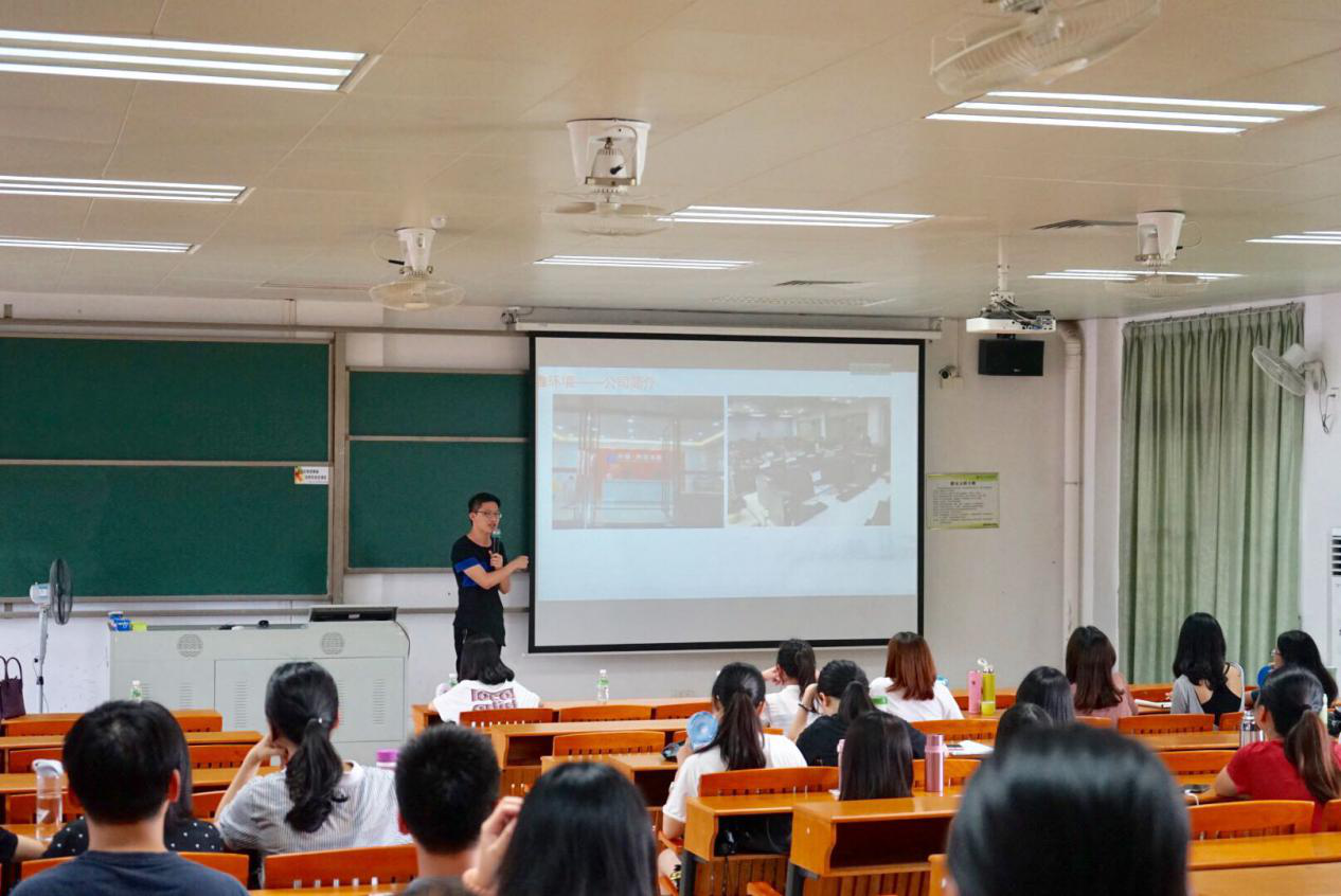 接着,张何文总经理就公司成长机制、学习内容、晋升机制、岗位要求向在座的同学们进行了详细的介绍,使同学们对彤鑫公司的招聘岗位有了进一步的了解。此外,张经理还向在座的同学们介绍了其公司的核心价值观及团队精神。其核心价值观为真诚、务实 、利他及共赢,而团队精神为同心、同德、同向、同行。企业宣讲最后,张何文总经理鼓励同学们积极报名,踊跃参与面试。