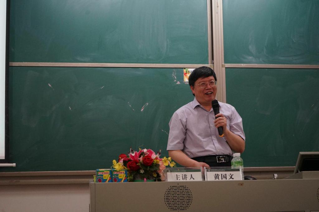 伴随着同学们热烈的掌声,讲座正式开始。黄国文教授用一首《十送红军》引入本次讲座的主题。他向在场师生详细讲解了整首歌的含义并分析了歌曲所反映出的自然背景和社会状况,由此引入本次讲座的主题:语言在表达人与自然的情感中起着重要的作用。