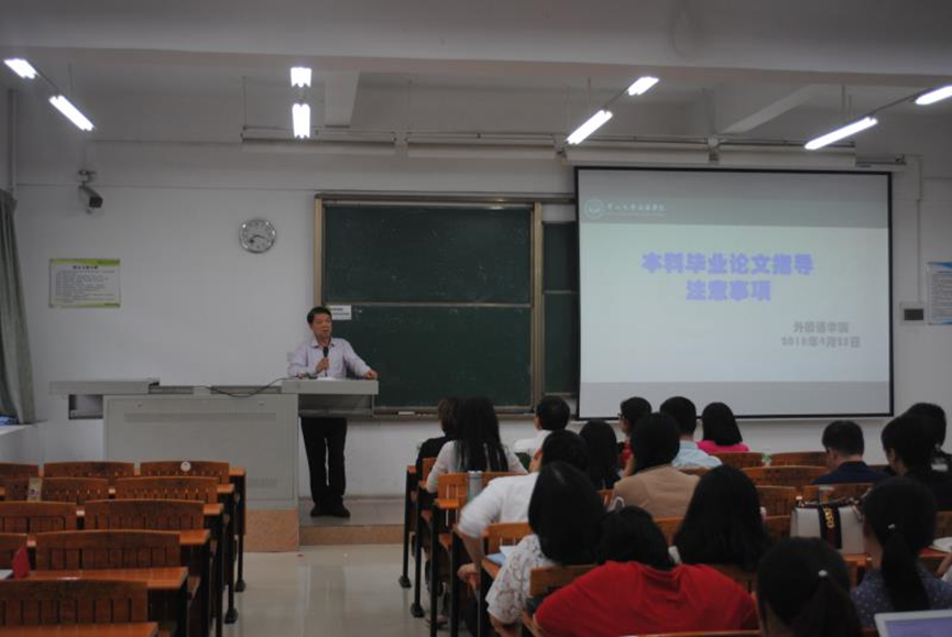为确保2018届外院毕业生论文质量,把好本科教育出口关,同时为2019届毕业生论文写作做好准备,2018年4月25号下午,太阳成集团tyc毕业论文指导工作经验交流会在公司东莞校区定静①B201召开。中山大学新华学院副董事长李中生,太阳成集团tyc经理廖益清,英语专业副主任李贻,商务英语专业副主任何瑜及太阳成集团tyc全体专职教师与会。