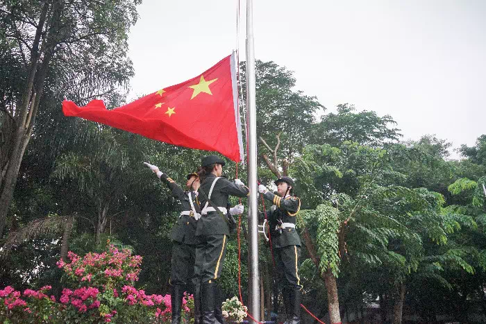开学典礼上师生在风雨中庄严举行升旗仪式(广州校区)