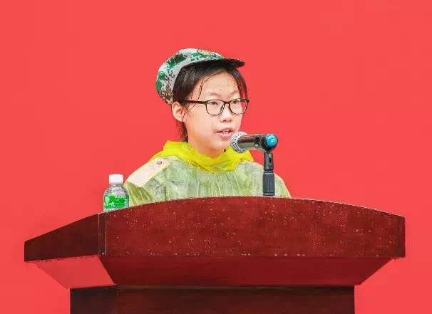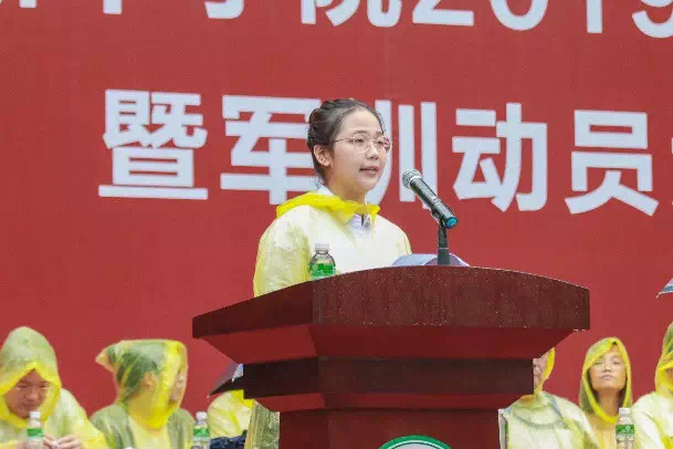 军训学员代表黄思琪同学发言,她代表2019级新生向学校领导、老师、教官们表达了服从命令、听从指挥、团结友爱、遵守纪律、吃苦耐劳、顽强不屈的决心,承诺会以高标准、严要求规范自身行为,并将保持军训期间的优良作风,应用在今后的学习和生活当中。