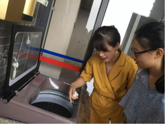 欧衍伽副书记(左一)和杨玲辅导员(右一)仔细查看洗衣机配备