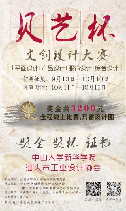 本着为潮汕贝雕提供更好的发展环境,创造更广阔的交流平台,汕头市工业设计协会携手中山大学新华学院共同举办了“贝艺杯文创设计大赛”。而设计大赛的发布会也将于2019年9月21日下午在汕头市工业设计协会举办的粤东“省长杯”巡展上进行。此次太阳成集团tyc代表陈绮雯老师和贝雕收藏家卢湘莹女士将受邀担任此次巡展上的比赛发布会主讲嘉宾。为献礼国庆70周年,也为本着“融入大湾区,设计新未来”的目的,我们将通过发布会吸引巡展上的其他高校学子参与设计大赛,也希望通过巡展上专家学者们的建议,对比赛的不足之处进行改正,为高校学子发挥设计灵感建设更好的平台。
