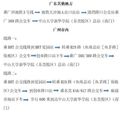 4.广州其它地方(1)可转乘地铁5号线到地铁大沙地A出口出站后前往港湾路口公交站转乘广369路直达中山大学新华学院(东莞校区)总站。(2)广州市内乘BRT公交线路到BRT夏园站,转乘B28路(鱼珠总站[鱼茅路]保税区)公交车到创业路口站下,转乘广368、369路直达中山大学新华学院(东莞校区)总站(又或者转乘东莞616、617路到麻涌市场站下车,前行600米到中山大学新华学院)。