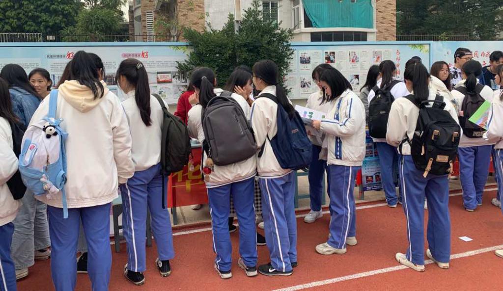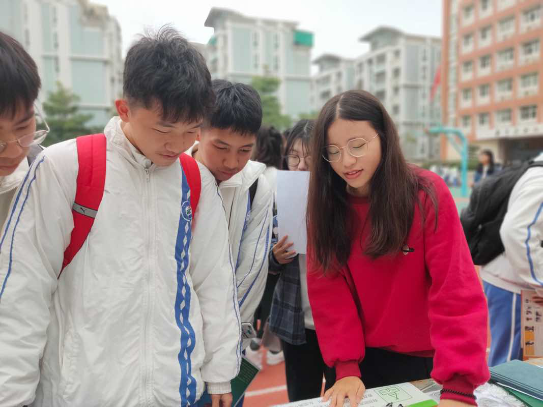 活动进行到高潮,摊位围满了前来咨询的学弟、学妹们,他们向我们咨询关于高考及公司往年的录取分数线、教学质量、住宿环境、饮食方面等情况,我们耐心地对各个问题进行一一解答,并且激励他们在最后关头应努力学习、保持初心、以平常心对待高考,争取考上理想的大学。