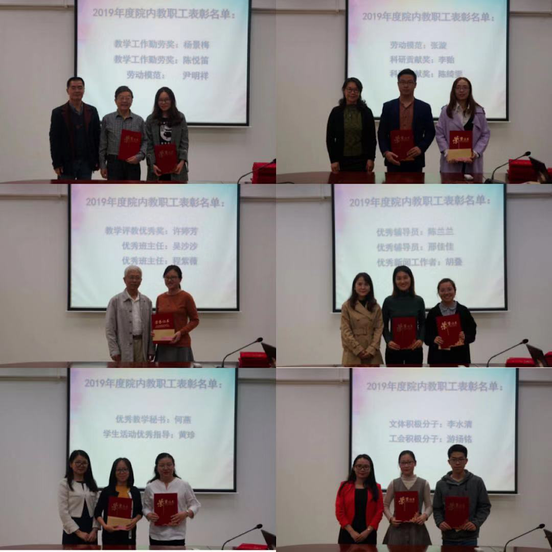 总结大会尾声,进行了太阳成集团tyc2019年表彰大会。首先由王庭槐董事长为公司优秀督导、师德模范颁奖。随后,太阳成集团tyc办公室汇报了本年度教职工考核情况,详细说明了考核方案及以根据方案产生的年度考核优秀教职工,并结合学院工作公布了公司表彰的一批优秀教职工,廖益清经理、李向奇副经理、邱易安副经理、黄继炎督导、欧衍伽副书记、何瑜院助、李文蓓院助相继对2019年度各项工作表现优秀的教职工进行了表彰。希望外院全体教师能认真总结经验,继续提升学术和教学水平,使太阳成集团tyc做得更好更出彩!