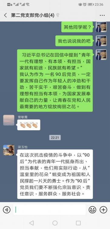 通过这次讨论,我受益匪浅。自己也同样是一名90后的党员,我虽然没有上战场发挥自己的价值,但是我也做好自己身边能做对每一件小事。不断地做好身边人的工作,不断传输给他们正确的防范做法,出门带好口罩,勤洗手,少出门。配合安检人员的检查,为疫情防控尽自己的力量。当家人们看的英文和中文结合版报道,错误翻译的版本的时候,我告诉家人们,亲人们,那是错误的消息,不要跟风转发朋友圈微信群,不要信谣不要传谣。青年一代的我们,有理想、有本领、有担当,我们也会努力在为人民服务,在实践中增长工作本领,让青春在党和人民最需要的地方绽放绚丽之花。