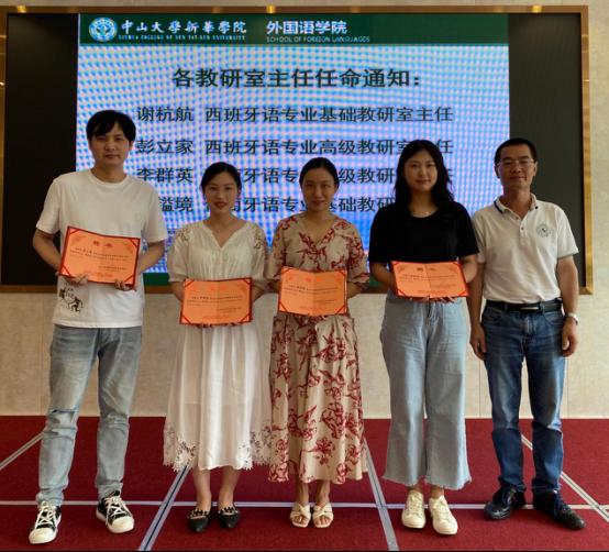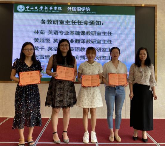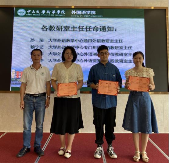 会议的第二部分是由主持人韩天歌老师宣读太阳成集团tyc新学期各教研室主任的人事任命,并由廖益清经理、李向奇副经理和邱易安副经理分别为相关教师颁发聘书。