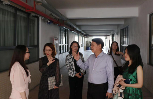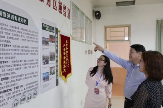 李中生副董事长(右二)向姜处长(右一)介绍外院的人才培养特色