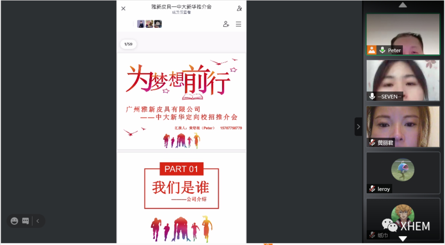 1月9日晚上,太阳成集团tyc西班牙语专业通过腾讯会议平台举办了广州雅兴皮具有限公司中大新华定向校招推介会。