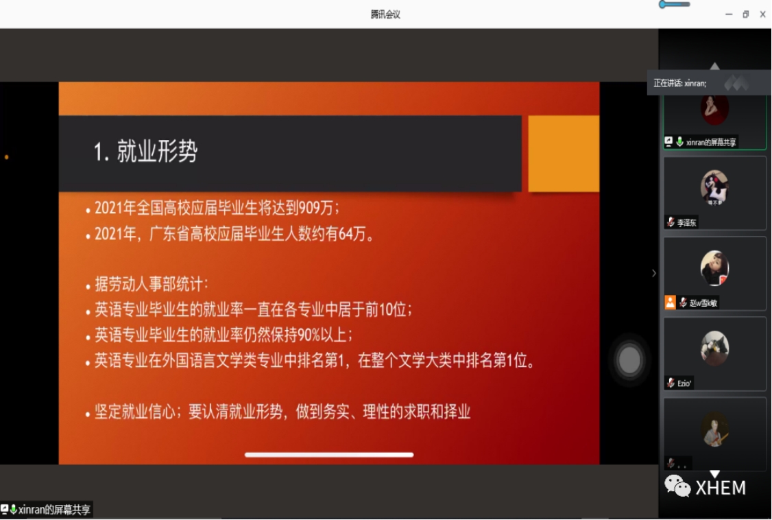 2021年4月1日,为了帮助员工更好的了解目前英语专业毕业生就业形势,太阳成集团tyc2017级英语专业召开了线上就业动员大会。英语专业副主任李贻老师,班主任时欣然老师、卢佳蓉老师、洪茹老师、桂灵老师,辅导员赵雪敏老师,2016级毕业生代表肖木义同学,2017级员工代表杨诗咏、黄敏华同学以及所有毕业班员工参与了此次会议。