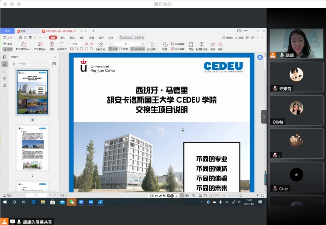 为了促进我专业员工多元化发展,加强大家对出国交流项目加深了解,2021年4月7日下午,西班牙胡安卡洛斯国王大学CEDEU学院中方负责人康老师就一年交换生项目面对我专业员工开展了线上宣讲会。公司专业副主任许婷芳老师组织并主持了此次会议。