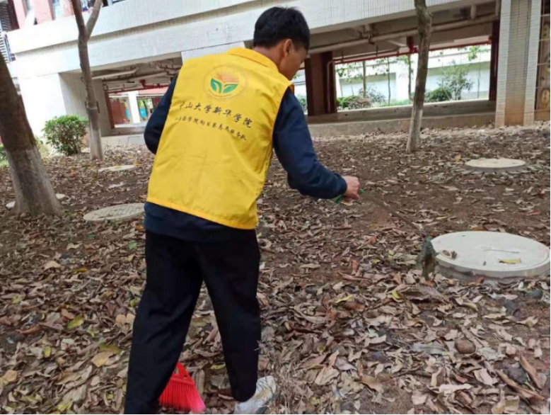 志愿者们分工合作、尽职尽责地打扫着。唰唰唰的清扫声与鸟声相映成彰,唱成一首和谐动听的歌曲。主干道路上的志愿者们认真打扫着,落叶一堆接一堆,不一会儿就被清扫干净。宿舍楼旁的草坪区散落着零星的垃圾都被志愿者们清理得干干净净,就连树丛中的缝隙也不放过。他们仔细检查,丝毫不马虎。、
