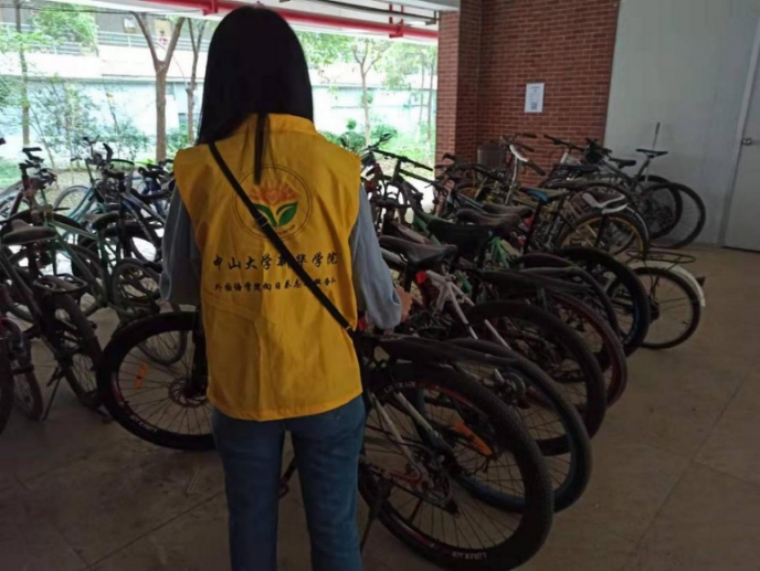 而另一边的宿舍架空层也出现黄衣志愿者忙碌的身影。由于总会有部分同学不听从学校建议,乱停自行车,乱放占道给他人出行带来不便,志愿者们便一次又一次把该范围内的自行车摆放整齐。