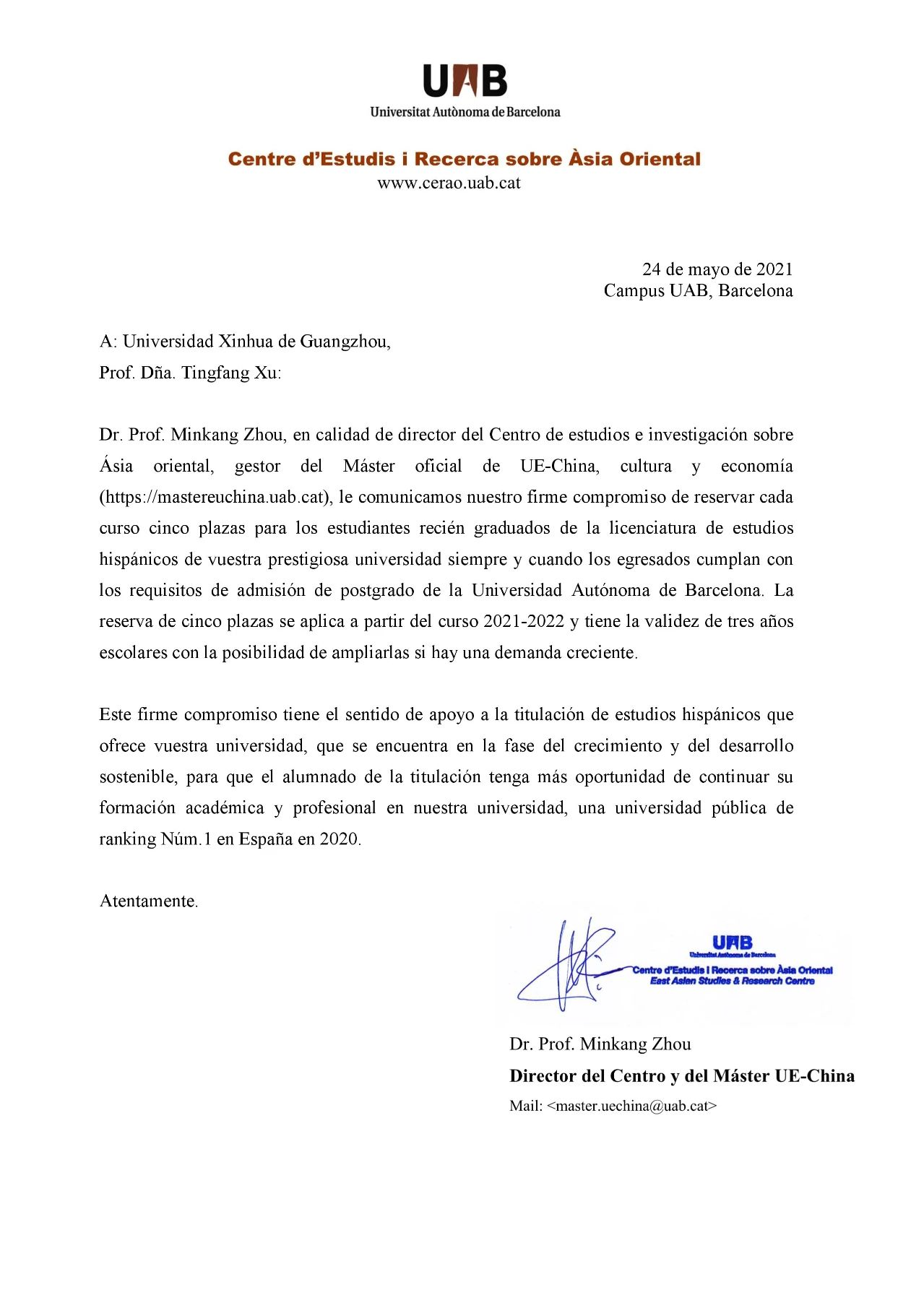 近日,经我专业首席教授、巴塞罗那自治大学翻译学院周敏康教授推荐,巴塞罗那自治大学中欧文化与经济官方硕士项目高度认可我专业毕业生培养质量,并表示为了支持我专业教学与发展,从今年起,该硕士项目将从每年的招生计划中划拨5个名额保留给经由专业推荐的毕业生,以助力优秀员工未来的深造与发展。