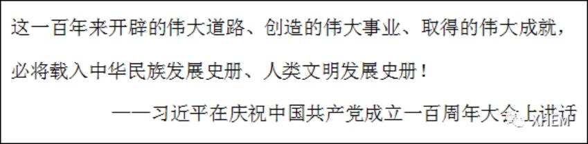 今年是中国共产党建党一百周年。一百年的时间,共产党从无到有、由弱到强、几经挫折、屡仆屡起的历史,对今天的我们有启发意义,告诉我们:每个人并给天生强大,而是在后天努力中一步步成长完善而变得强大;人生并非总是一帆风顺,之所以能够取得成就,无非是在荆棘坎坷中坚韧地前行。