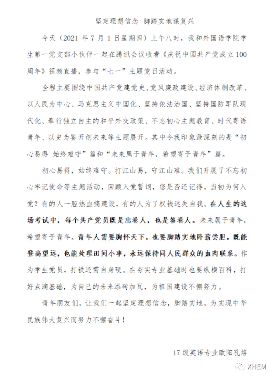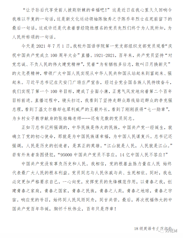 17英语专业黄晓诣:“跟随党的领导,保护江山,保护人民的红色江山。作为党员,我们需要坚持党的领导,坚持正确的政治思想方向,为中华民族的伟大复兴贡献自己的一份力量!”