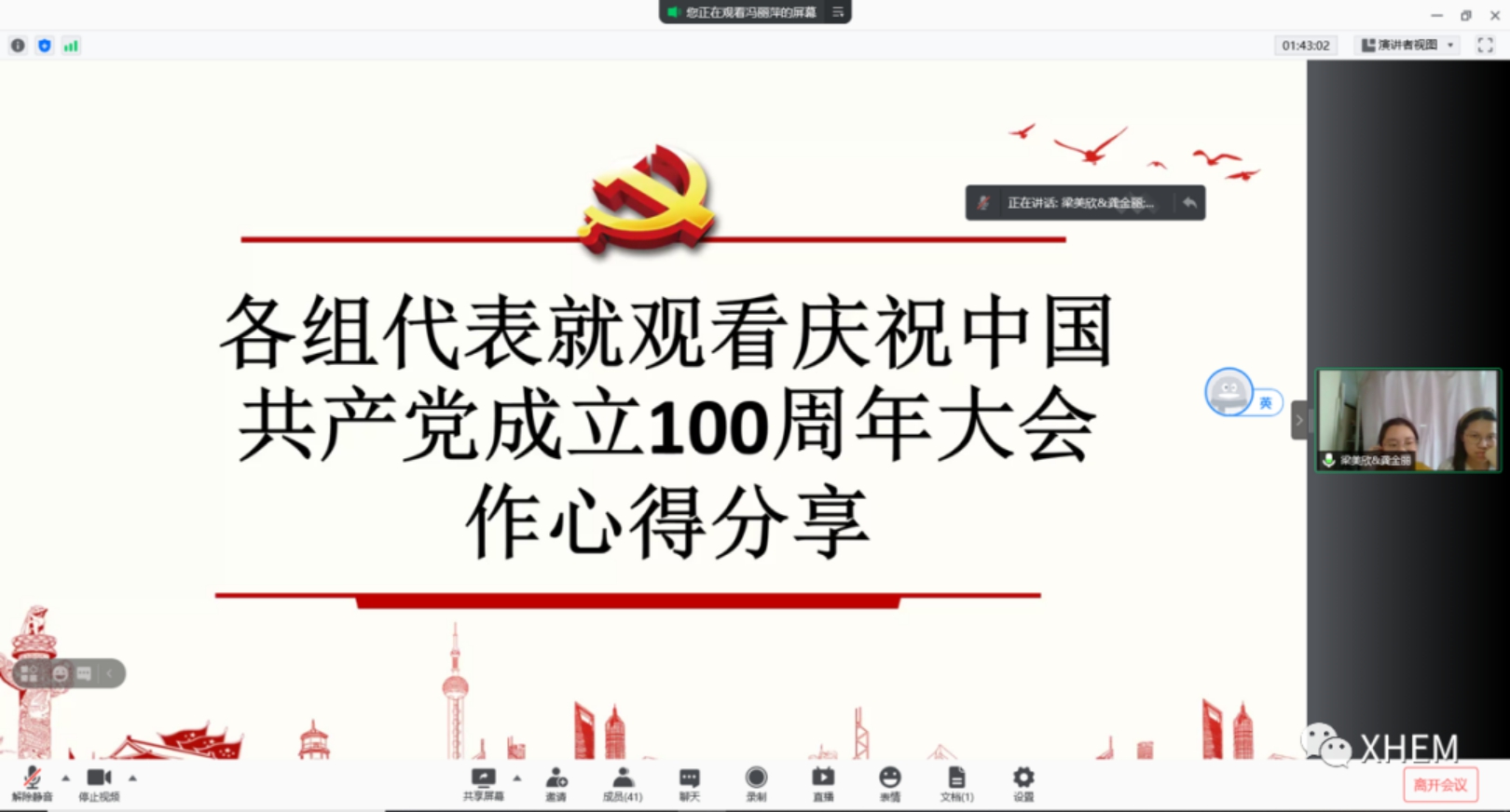 奏唱国歌,阅兵式,青年代表朗诵等庆祝表演过后,习近平总书记发表演讲。总书记铿锵有力的致辞震撼着全中国人民的心,振奋着党员同志们那赤诚且坚定的决心——为践行党的宗旨而不懈奋斗。随着雷鸣般的掌声,总书记的演讲落下了帷幕。建党百年,风雨兼程。不忘初心、牢记使命。支部党员们的内心久久不得平静,虽是屏幕相隔,但丝毫不减大家分享心得的热情,支部以小组为单位,邀请了多名代表分享心得: