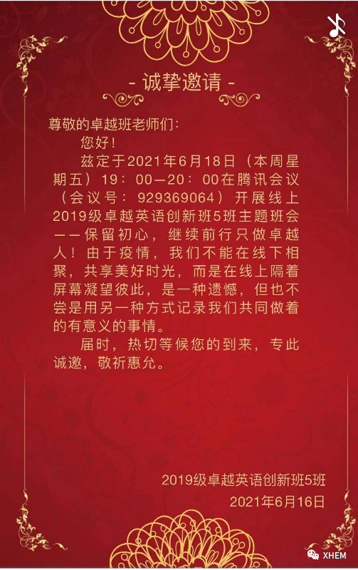 每一年凤凰花开时,就是一个员工走向另一个更高台阶的好时机,开启新的奋斗征程。两年的卓越班生活,充满着欢声笑语,这些甜蜜的回忆也将随着我们的结业而画下一个完整的句号。但终点也是新的起点,我们依然还会带着那份初心继续前进。在六月下旬,2019级卓越英语创新班5班(以下简称卓越5班)班委们精心策划了“保留初心,继续前行,只做卓越人”线上结业主题班会,并邀请卓越班老师们和卓越5班全体同学一起参加。