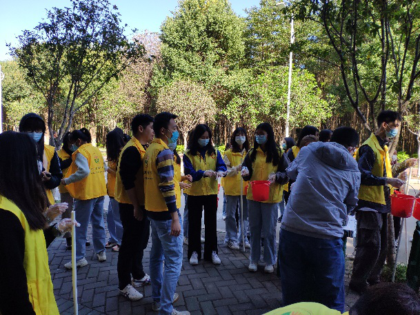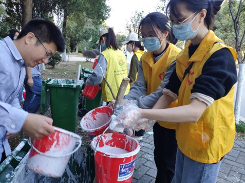 总务处老师帮助同志们调配好白石灰,并向师生党员们分发工具,同时介绍树木涂白的高度标准及注意事项等。前期工作准备就绪后,各队小组长负责清点工具及路线规划。