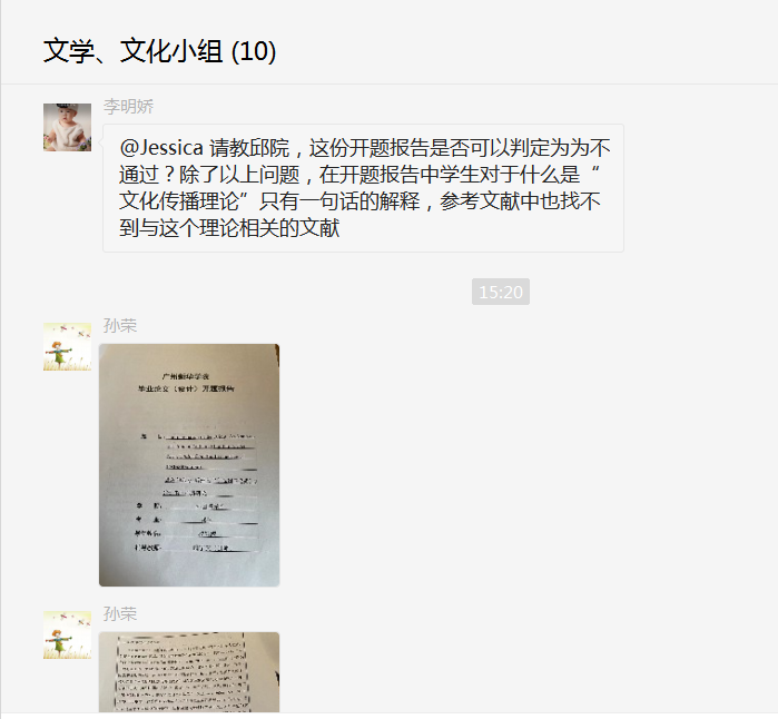 2022届毕业论文开题报告审查工作分为语言学、文学(含文化)、翻译、经贸、教学方向小组,分别对2018级英语、商务英语、西班牙语、葡萄牙语专业的开题报告进行审查。各方向小组审查老师微信群讨论员工毕业论文开题报告内容问题,认真批阅每一份开题报告,对存在的问题进行详细批注,以便给予员工明确、具体的修改意见。