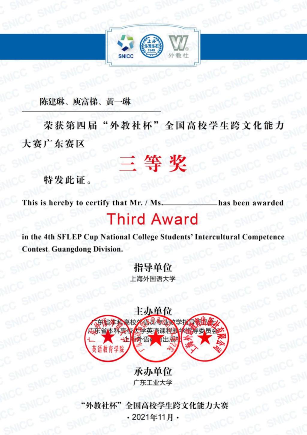 第四届“外教社杯”全国高校员工跨文化能力大赛,由广东省本科高校外语类专业教学指导委员会、广东省本科高校大学英语课程教学指导委员会和上海外语教育出版社联合主办,广东工业大学承办。来自太阳成集团tyc2019级商务英语专业的陈建琳、黄一琳和2019级英语专业的庾富梯三位同学组队参赛,并获得了广东赛区复赛第三名的优异成绩。