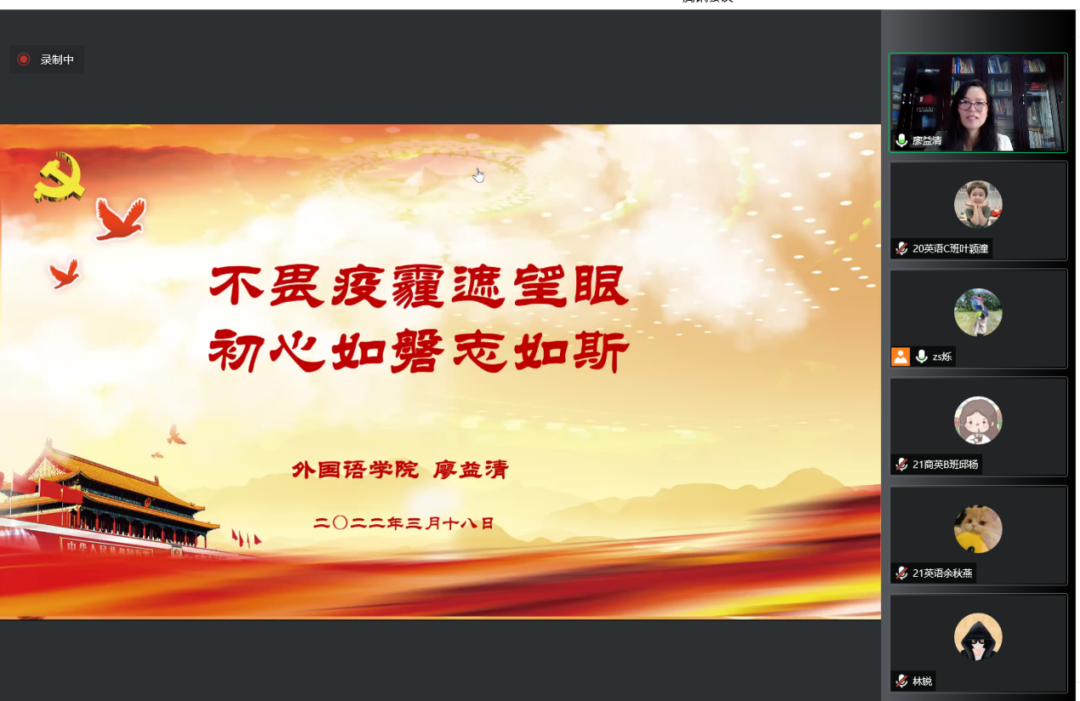 接着,廖益清经理与同学们讨论了“战疫之我见”。廖经理指出,新冠疫情初始,谣言四起,纷纷扰扰,迷雾缭绕。西方某些媒体基于殖民主义思维,试图向中国甩锅,将中国和病毒构建为“他者”。因此同学们在生活学习中,尤其在外语学习中,要学会运用批判性思维,明辨是非。抗疫至今,中国政府始终坚持“人民至上,生命至上”,始终把人民群众的生命安全和身体健康放在第一位,依靠人民群众,全员动员,全民参与,全民配合,我国经济发展和疫情防控保持全球领先地位。同时我们秉承“人类命运共同体”理念,积极支持国际社会抗疫。透过战疫,我们更加深刻地理解党的领导是战胜一切艰难险阻的“关键核心”;我们看到坚持和发展社会主义制度是实现强国复兴的根本之路;我们看到依靠和发动人民群众是一切工作的“制胜法宝”;我们看到冲锋在前的共产党员是紧要关头的信心信赖。