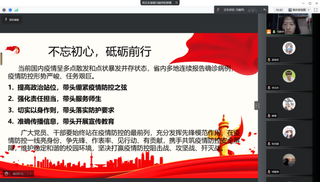 最后,主持人冯丽萍号召同志们要“不忘初心,砥砺前行”,面对当前较为严峻的疫情,广老员工党员们在做好防护的同时应充分发挥自己的先锋模范作用,协助完成校园环境和谐稳定的维护工作,打赢疫情防控阻击战!