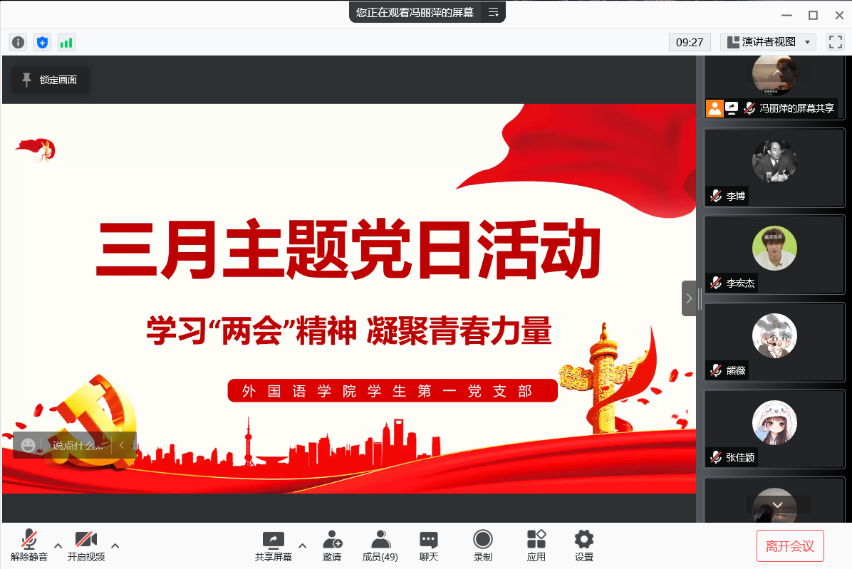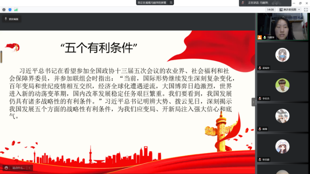 会上,主持人冯丽萍首先对两会的基本概述与召开时间进行了普及,随后带领大家学习习近平总书记在全国两会期间的重要讲话精神,组织支部同志们各抒己见,发表自己的看法。