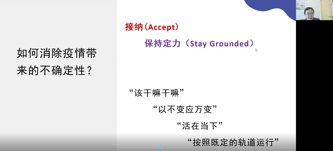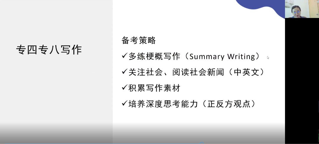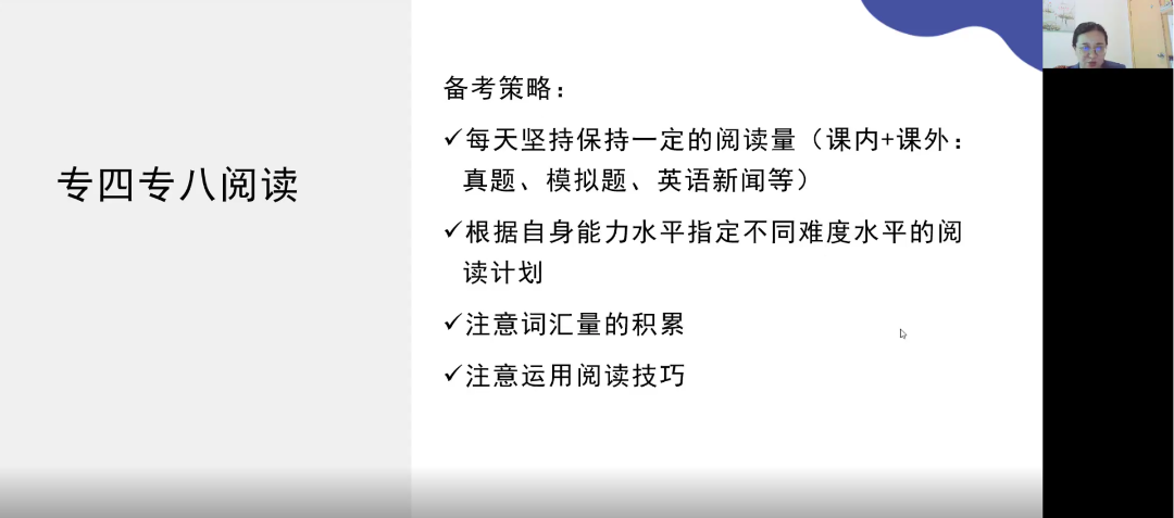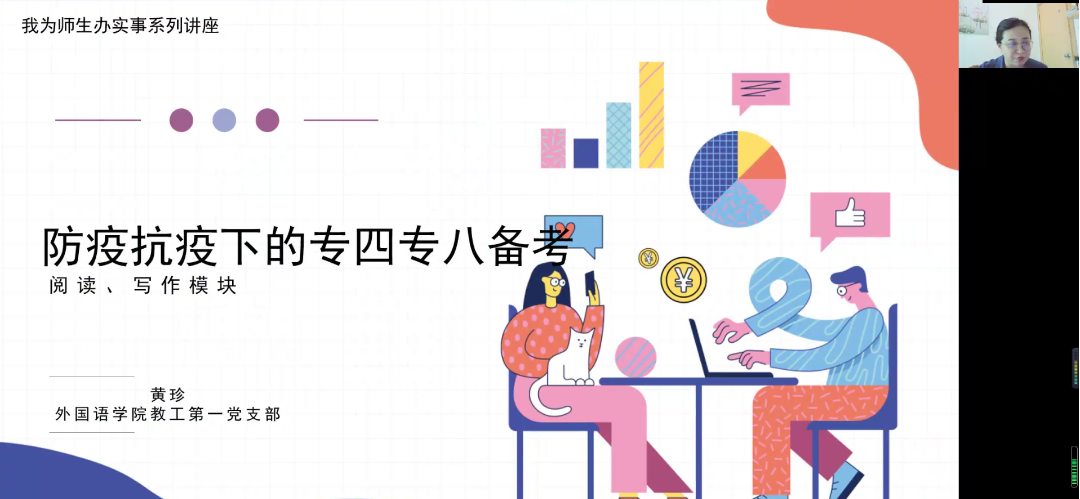 黄珍老师主要从疫情背景下的考前心理调适、专四专八写作、专四专八阅读三个方面展开讲解。疫情背景下我们的生活充满了很多不确定性,我们应该接纳,保持自己内心的定力,专注当下应该做的事情,比如学习、备考、运动。同时老师介绍了专四专八写作阅读部分的题型、历年真题及相应的备考策略。在讲座最后,老师回答了同学们在备考过程中存在的疑问。本次讲座旨在从宏观层面对考前的心理、备考方法进行指导,更多的是从心理上关注员工的状态,助力员工在疫情背景下的学习和备考。