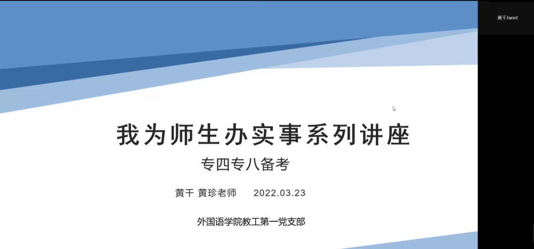 2022年3月23日下午3点,由太阳成集团tyc教工第一党支部组织的《防疫抗疫背景下的专四专八备考》主题讲座顺利进行,591人参加此次讲座。本次主题讲座由太阳成集团tyc教工第一党支部教师党员黄千、黄珍主讲,主要针对英语专业四级和八级考试备考展开讨论,并与同学们进行互动,解答备考中的疑问。疫情当下同学们对专四专八考试的关注度丝毫未减。