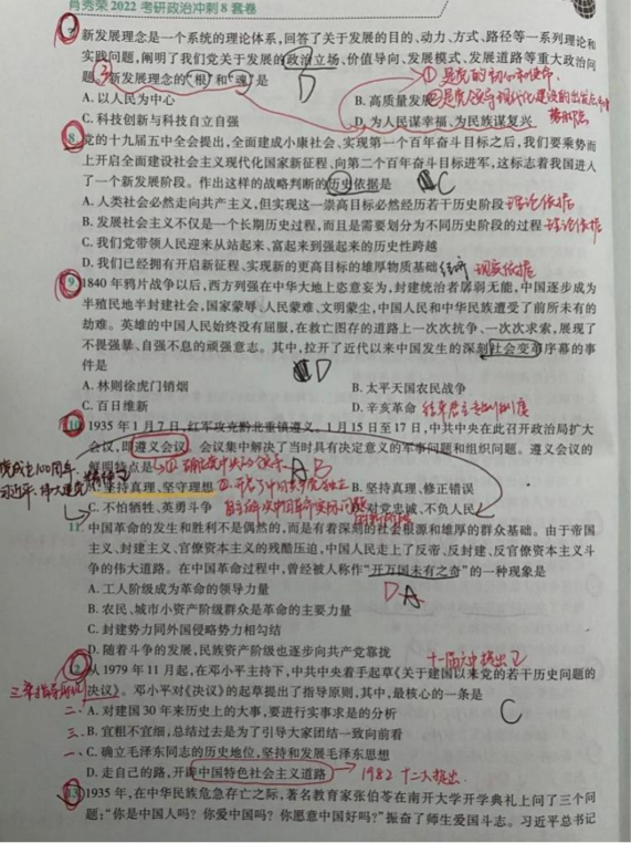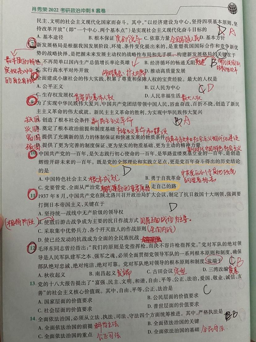 政治:政治最好早点看完徐涛老师的精讲的课程,前期以理解为主,等到肖四出来后再反复刷选择题,选择题只做肖四和肖八足够了,但是错题一定要分析并且多多回顾。关于主观题的背诵在考前最后一个月开始,可以参考肖八以及腿姐最后出的背诵资料,这两份资料其实重合度挺高的,大家可以酌情选择。如果有时间的话可以看一下腿姐的冲刺班,里面会分享一些解题思路和技巧,很实用!