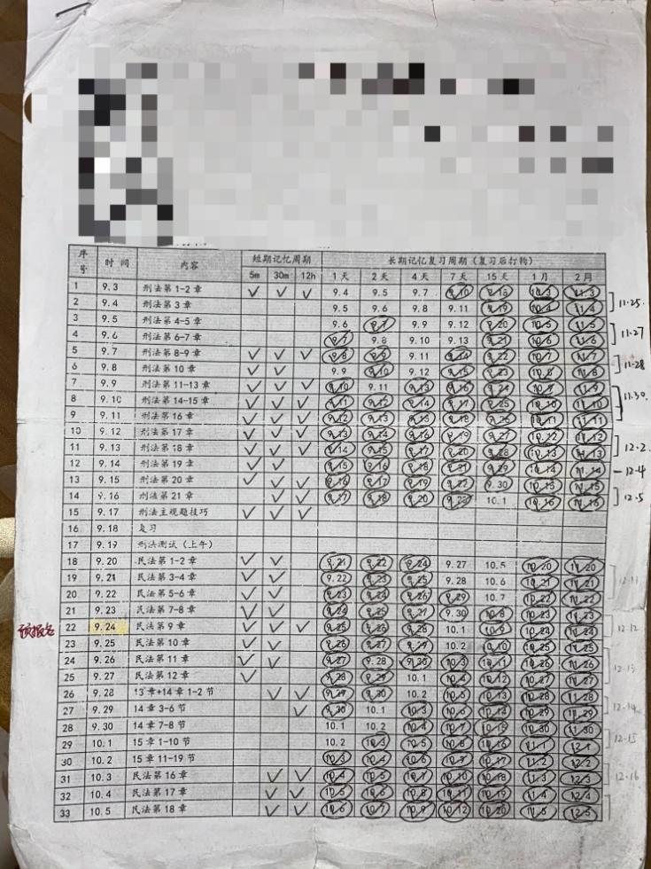 这是我的背诵表大家可以参考一下,虽然按照这个记忆曲线来背诵背到中期会特别的痛苦,但是一定要坚持下来,到后期会轻松很多,到后期你会发现你拿出提纲随便抽一个问题都能记得七到八成。