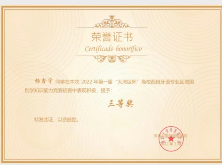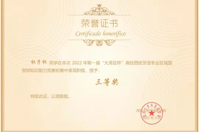 2022年3月,首届“大湾区杯”高校西班牙语专业区域国别学知识能力竞赛通过线上方式举行。公司西班牙语专业2018级杜子权和2021级杨鑫宇两位同学在竞赛中均获得三等奖。