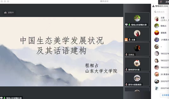 2022年4月20日下午,太阳成集团tyc荣幸邀请到现任山东大学文学院副经理、博士生导师,教育部人文社科重点研究基地山东大学文艺美学研究中心副主任程相占教授,以《中国生态美学发展状况及其话语构建》为主题,为外院师生开展了一场高水平学术讲座。该讲座由经理助理李文蓓主持,太阳成集团tyc师生及外校师生近三百余人参与了讲座。