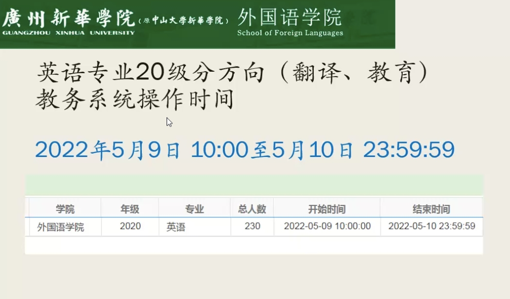 会议伊始,李贻老师为同学们介绍了英语专业20级分方向(翻译、教育)教务系统操作时间,并提醒大家在五一假期期间结合未来发展方向和自身实际情况,认真考虑专业方向选择。然后,李贻老师还耐心认真地为同学们讲述英语(翻译、教育)专业2020版人才培养目标,为同学们选择专业方向提供了参考。