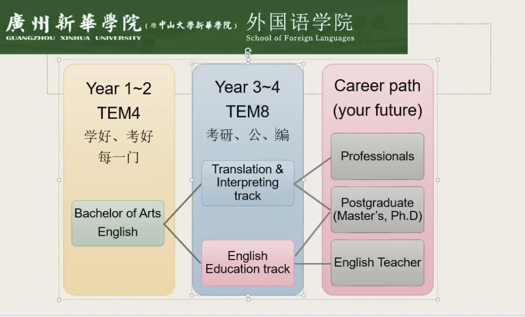 接下来,黄千老师为我们详细地介绍了英语教育方向的特色课程,并为同学们讲解了教团队格证的相关信息。黄千老师说无论同学们以后选择了哪条道路,都有它存在的意义,每条路都有它自己的精彩之处,希望2020级同学们在不断的探索中找寻到自己心中想要的那份答案。