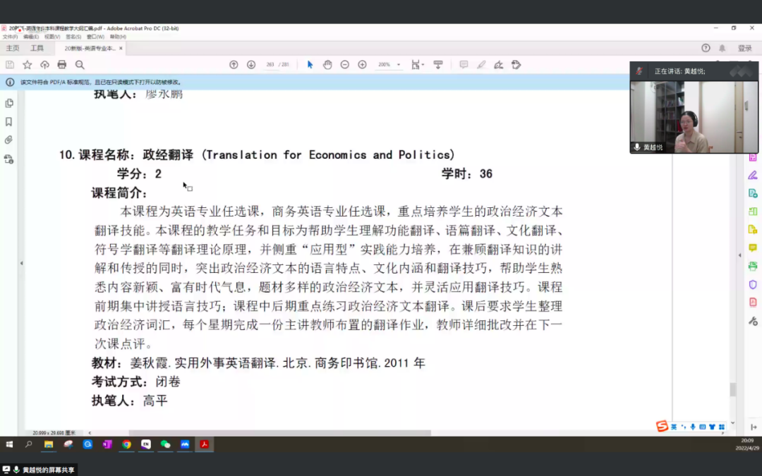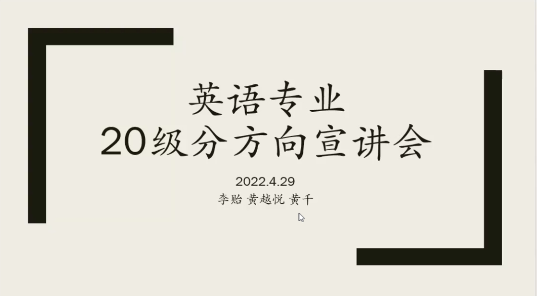 为帮助2020级英语专业员工更好面对即将到来的专业分方向选择,2022年4月29日周五晚8点,外国语言文学系英语专业20级分方向宣讲会在腾讯会议顺利召开。宣讲会由英语专业副主任李贻老师主持,翻译教研室主任黄越悦老师、教育教研室主任黄千老师参会并作了讲解,2020级英语专业全体员工超过200人参加。