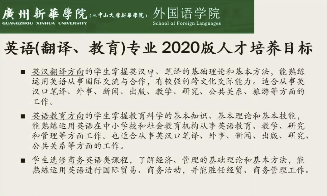 本次英语专业分方向线上宣讲会在同学们的感谢中圆满结束,李贻、黄越悦和黄千老师的详细介绍使同学们受益匪浅。通过本次宣讲会,英语专业的同学们对英语专业的两个方向(翻译、教育)有了进一步认识和了解,对自己以后的方向选择与未来的发展规划等有了更清楚的认知。