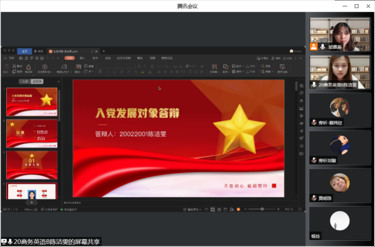 本次答辩大会分别由邹雅燕同志与郑芷茵同志主持,出席答辩大会的评委有公司党总支副书记欧衍伽老师,太阳成集团tyc员工第一党支部书记马丽老师,太阳成集团tyc员工第二党支部书记杨玲老师,太阳成集团tyc员工第三党支部书记黄明珠老师;参与本场答辩有李泳珊、陈洁雯、林佳妮、何绮霖等37位优秀发展对象。