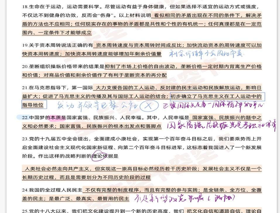 虽然网上许多考研博主都说政治这科不用开始那么早,但我认为每个人情况不一样,最重要的是要根据自身情况制定学习计划。我是7月中旬开始准备的,一开始我刷徐涛老师的强化课程,对应刷肖秀荣的1000题。这一阶段结束之后一直到十一月左右,我把书里的内容过了两三次,1000题二刷,把错题拎出来巩固。考试前的一个月主要刷肖秀荣8套题的选择题,每天一套,前后刷了2-3遍,考前最后一两周刷肖秀荣4套卷的选择题,刷3遍,背诵4套卷的大题。这一科需要不断总结错题,对相似的容易混淆的知识点进行归纳和总结,光背知识点效率不高,应该结合题目去理解和掌握。
