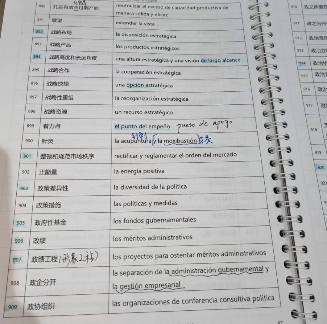翻译练习我主要用到的是黄皮书口译80篇,虽然这是口译,但我把它当作笔译使用。针对词条翻译方面,《中国关键词》这本书可以多读,对于提高术语和词条的反应能力很有帮助。多关注政府工作报告、两会、以及国内外重大事件周年纪念日上领导人发表的演讲,这些一般都能在网上找到西语版的翻译,可以拿来学习。此外要注重总结各类国际机构、尤其是与西班牙语国家相关的,一些政治、经济、科技专有名词都需要积累。今年广外词条翻译侧重政治类和中国谚语、成语和古文短句的翻译,这是没有意料到的,不过幸好平时上课时有练习过这类型的翻译,考试时就不至于那么慌。