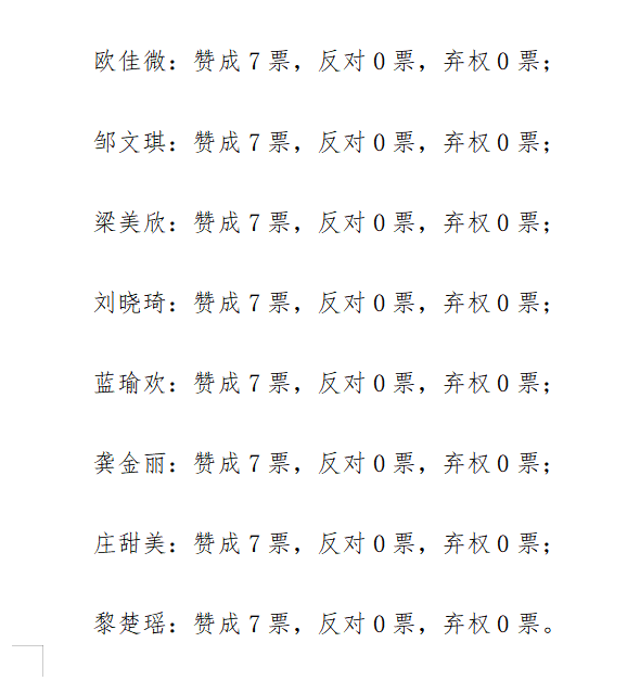 本支部应到正式党员12名,实到7名,经过评议和无记名投票表决,同意欧佳微等8名同志按期转正为中共正式党员。名单及得票情况如下: