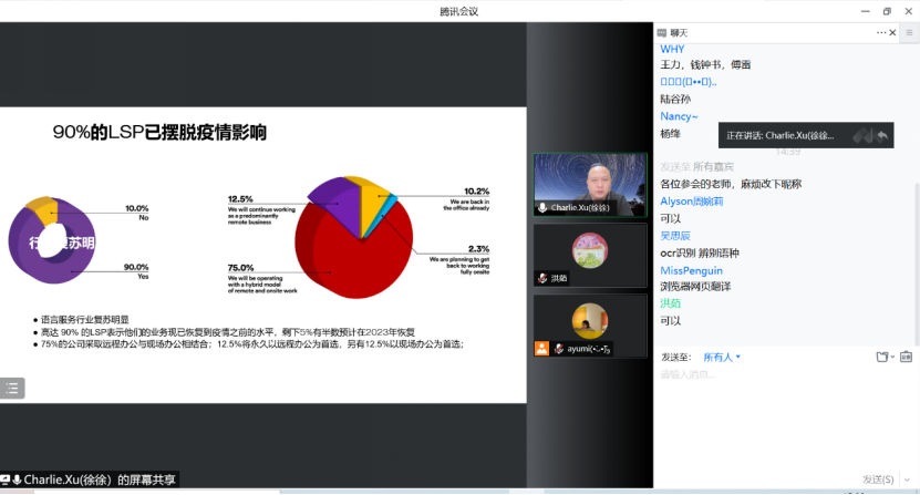首先徐总先用对比的方式,提出语言服务行业的诞生、发展和现状,也凸显了翻译和翻译工作在越来越国际化数字化的全球经济中,越发重要的桥梁作用。通过全球各区域语言服务行业的规模占比比较,中国目前的语言服务仍然具有极大的潜力和前景。疫情期间,语言服务行业与前沿科技、数字经济的结合更为明显,成为新兴服务行业中实现为数不多的正增长行业。