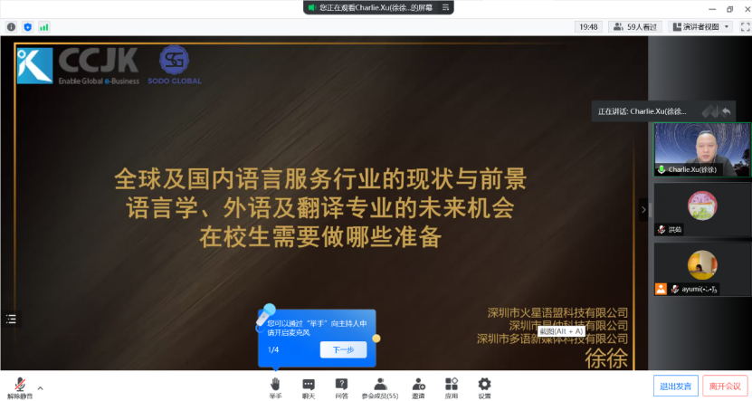 参会师生们从徐总的讲座里了解了市场对翻译和语言服务行业的人才需求,也开拓丰富了语言服务的行业需求以及语言服务广阔的应用天地。徐总也对大家明确表达了要深耕某一领域,夯实语言基础,丰富实战经验的殷切期望。参会师生也利用此难得的机会,与徐总进行了互动和提问,受益匪浅。